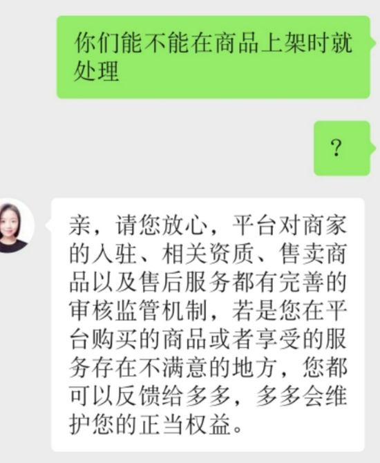 拼多多客服回复称,“系统会去审核优化”、“亲,请您放心,平台对商家的入驻、相关资质、售卖商品以及售后服务都有完善的审核监管机制,若是您在平台购买的商品或者享受的服务存在不满意的地方,您都可以反馈给多多,多多会维护您的正当权益”。