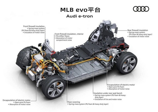 同样,奔驰EQC和奥迪e-tron为了保证电池安全,也不会把底盘空间塞满电池,甚至给电池包内外做一些物理保护。像奔驰EQC的电池组之间的用了硬质发泡吸能材料,奥迪e-tron则在电池内部用铝合金骨架来分隔不同的模组。