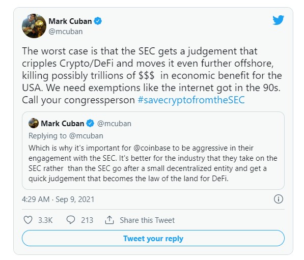 此前,Cuban在Twitter上对Coinbase首席执行官兼创始人Brian Armstrong表示:“这是’通过诉讼进行监管’。他们自己没有能力解决这个问题,并且害怕在这样做时犯错误。他们把它留给律师。你必须继续进攻。”