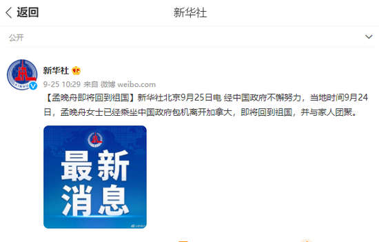 新华社北京9月25日电 经中国政府不懈努力,当地时间9月24日,孟晚舟女士已经乘坐中国政府包机离开加拿大,即将回到祖国,并与家人团聚。