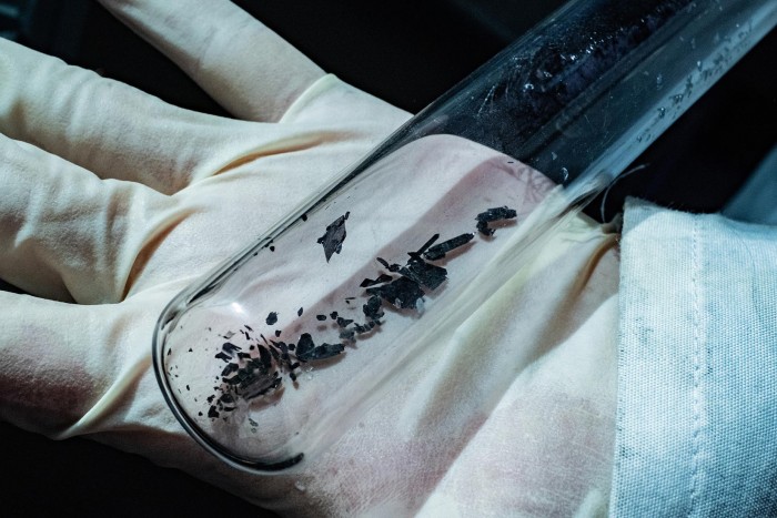 研究生Lebing Chen展示了他在莱斯大学实验室制作的三碘化铬晶体。原子级薄的二维三碘化铬的堆积层具有不寻常的电子和磁性,可能被证明对"自旋电子"技术有用,该技术将信息编码在电子的自旋中。
