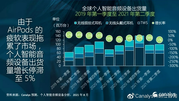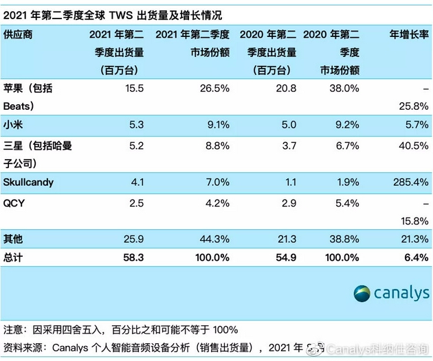 原标题:全球 TWS 市场2021 年第二季度增长率为 6.4%,为近三年来最低