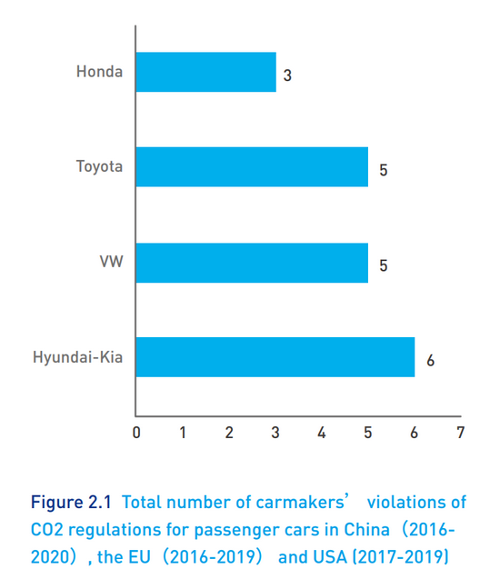 数据显示,在2016年至2020年期间,在中国市场,丰田汽车碳排放表现最差,有5次未达标;其次为现代起亚和本田,3次未达标;大众汽车碳排放有2次不达标。而在美国市场,大众和现代企业均有3次未达标。神奇的是,丰田这5年间在美国没有不达标记录。