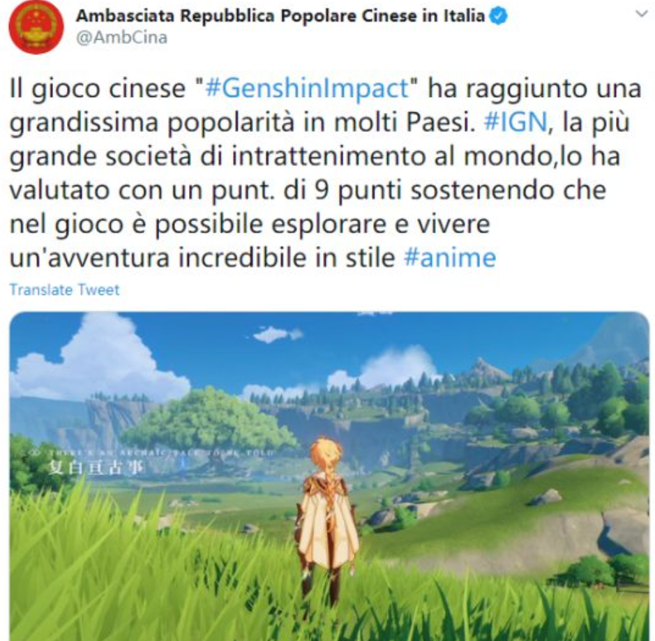 在去年 10 月,中国驻意大利大使馆还在官推上直接宣传原神,称 “ 这款作品已经在许多国家获得了极大的知名度,世界上最大的游戏媒体 IGN 对其给出了 9 分的高分,可以在游戏出色的动画风格中进行难以置信的冒险。”