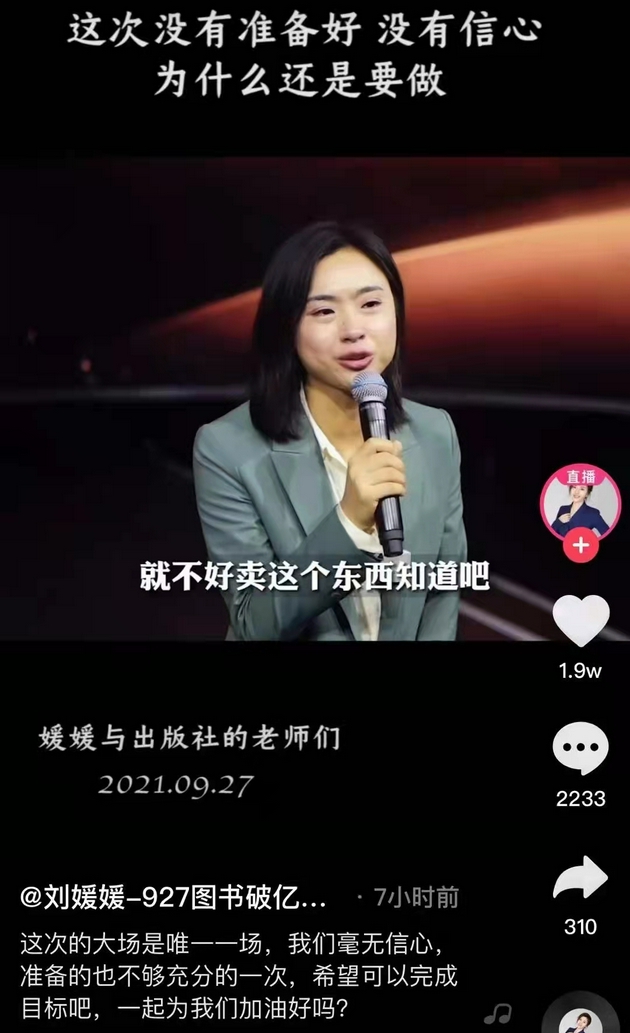 9月27日,图书销售领域的顶流主播刘媛媛开启了亿元专场的直播,号称“叫来了中国出版社的半壁江山”,并在预告中标明“准备了50万册书破价到10元以下,10万册1元的书,爆款书突破了双十一价格”。