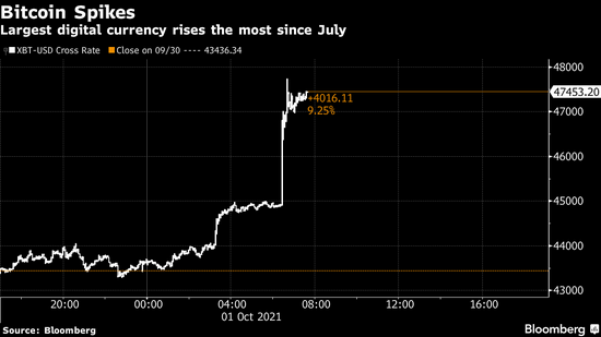 比特币大幅跃升,在短短几分钟内创下7月份以来最大单日涨幅。其他数字货币也上扬。比特币在9月曾创下5月份来最大月跌幅。这个最大的加密货币在纽约市场早盘一度上涨9.9%至47742美元。莱特币和EOS也上涨,彭博银河加密货币指数一度升8.3%。比特币在9月份下跌7.6%,因市场担心监管压力加大。
