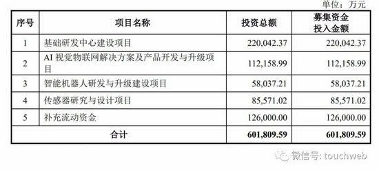 包括基础研发中心建设、AI 视觉物联网解决方案及产品开发与升级项目、智能机器人研发与升级建设、传感器研究与设计项目、补充流动资金。