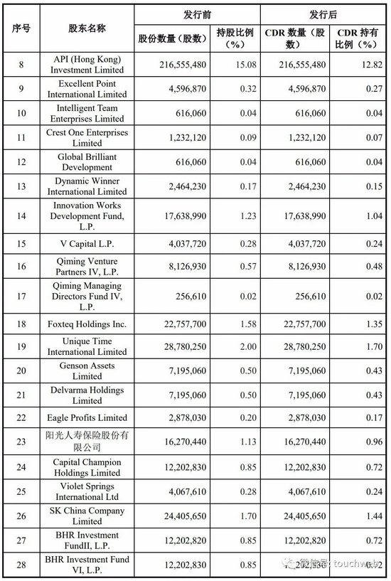 Foxteq Holdings Inc.持股为1.58%,创新工场旗下Innovation Works持股为1.23%,科威特投资局持股1.22%,GGV持股为0.49%。