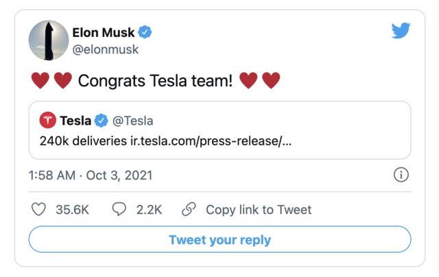 马斯克也在推特上对这一创纪录的交付量表示了喜悦。