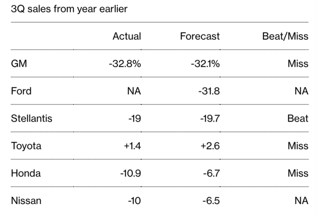 通用汽车公司受到的打击最大,该公司9月份关键的卡车工厂停产,使得其第三季度在美国的汽车销量为446997辆,较去年同期下降33%。