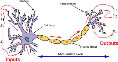 许多简单的单元(“神经元”)连接到许多其他单元(通过“突触”),一个神经元接收来自许多其他神经元的信号,当刺激达到某个阈值时,它会将自己的信号发送给周围的神经元,大脑则通过调整神经元之间的连接强度来学习。