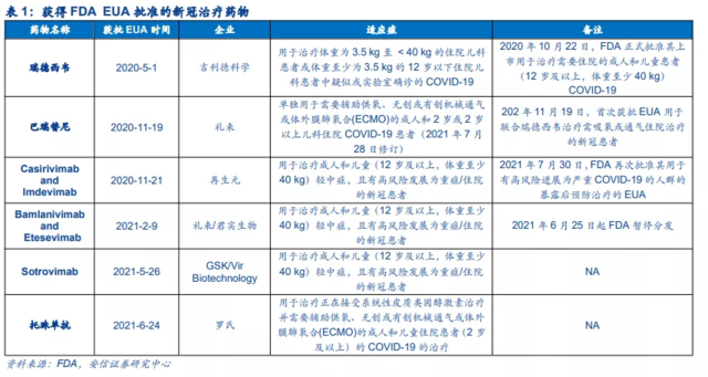 在治疗药物方面,也已经有部分药物获FDA批准或者通过紧急使用授权(EUA)的方式用于新冠患者的治疗,包括2个小分子新冠药物—瑞德西韦和巴瑞替尼,3个新冠中和抗体疗法—Casirivimab和Imdevimab联合疗法(再生元)、Bamlanivimab和Etesevimab联合疗法(礼来/君实生物)、Sotrovimab(GSK/Vir Biotechnology),以及抗细胞因子受体抗体托珠单抗。
