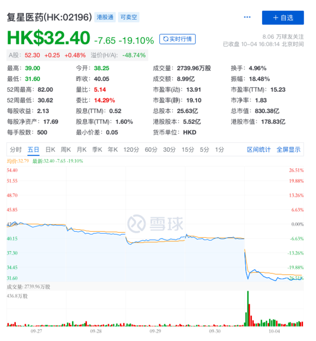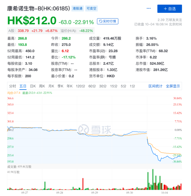 与此同时,受该消息影响,4日港股疫苗股同样出现暴跌,康希诺和复星医药当日分别收跌23%和19%。