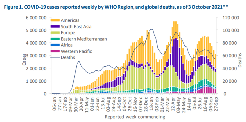 当地时间10月5日,世卫组织发布的新冠肺炎每周流行病学报告显示,上周全球新冠肺炎新增确诊病例和新增死亡病例均继续下降。上周全球新增确诊病例超过310万例,除欧洲区域新增确诊病例数量增加,其他区域新增确诊病例均出现下降。