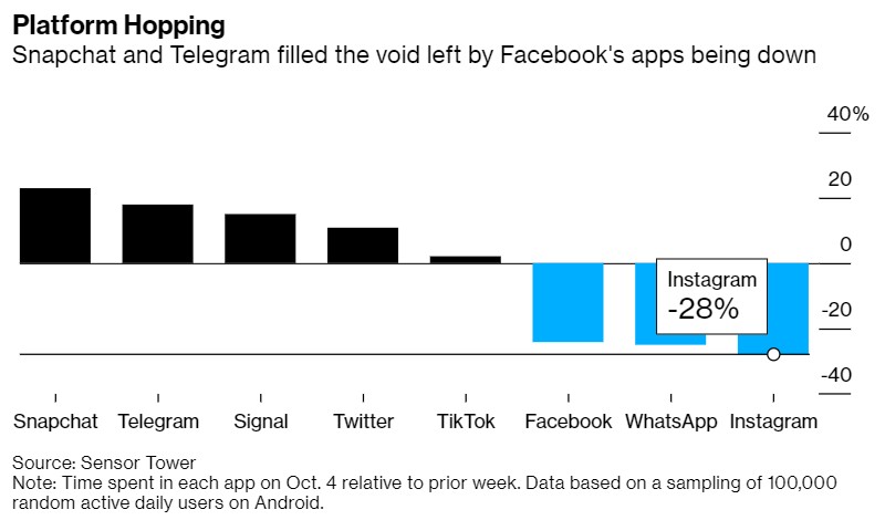 据Sensor Tower与有关媒体统计的数据,Snapchat用户当地时间周一在Android应用程序上花费的时间较前一周同日增加了23%。数据还显示,在当地时间10月4日,Telegram、Signal以及Twitter (TWTR.US)等应用程序的活跃程度明显增加。