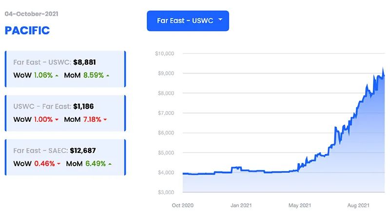 与此同时,长期合同的运价却在继续攀升。反映长期合同运价走势的Xeneta Shipping Index (XSI)显示,最新一期远东到美国西海岸(USWC)合同运费水平已接近9000美元,较去年同期上涨超过100%。