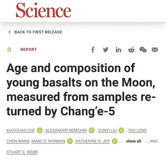 由中国地质调查局中国地质科学院地质研究所北京离子探针中心刘敦一研究员和地质所海外高级访问学者澳大利亚科廷大学Alexander Nemchin教授领衔的国际研究团队,在嫦娥五号采集的月球样品研究方面取得重大进展,团队对嫦娥五号月球玄武岩开展了年代学、岩石学、矿物学研究,为完善月球演化历史作出了重要贡献。有媒体报道,《Science》杂志现在每年大约要收到约1.4万份论文投稿,经过层层筛选,最终能够发表的不足10%。