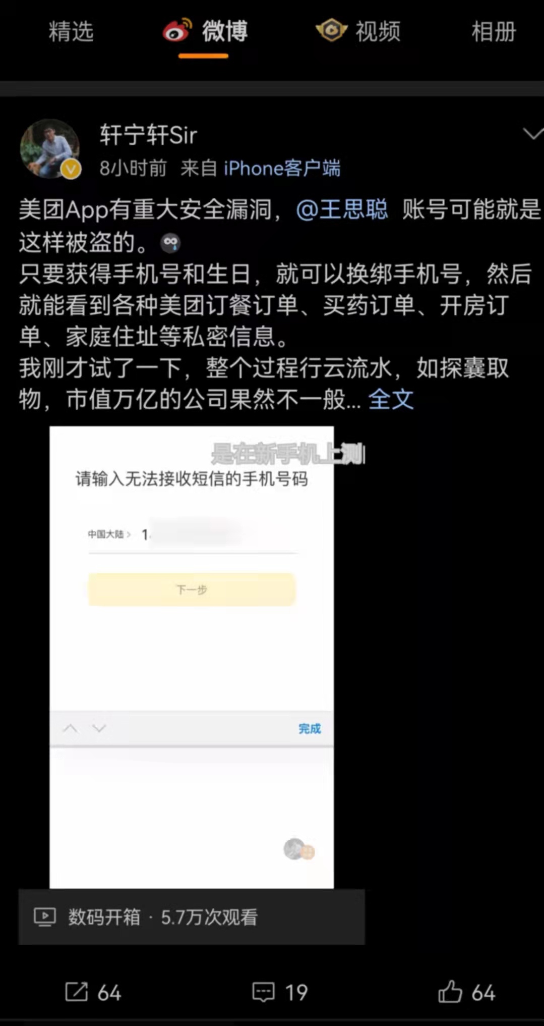10月10日,王思聪微博发文称,自己的大众点评被别人改绑手机号。王思聪同时@大众点评,并质问道:“这就是上万亿市值公司的安全系统吗?”10月11日,博主@轩宁轩Sir 爆料称美团存在安全漏洞,只要获得账号本人的手机号和生日,就可以修改绑定手机号,然后就能看到各种美团订餐订单、买药订单、开房订单、家庭住址等私密信息。