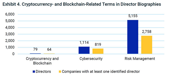 此外,企业董事会成员似乎缺乏加密货币方面的专业知识。MSCI搜索大约6,500名董事会成员的简历,发现64家公司中仅有79人有加密货币或区块链方面的经验,1,114人有网络安全方面的经验。与此同时,搜索“风险管理”的结果为5,155人。