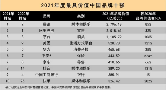 腾讯升至百强榜首,品牌价值同比增长85%,达到2796亿美元;阿里巴巴(2019亿美元)和茅台(1106亿美元)紧随其后,排名第二和第三名;抖音(排名第八位,389亿美元)和快手(排名第十位,326亿美元),双双首次进入榜单前十。