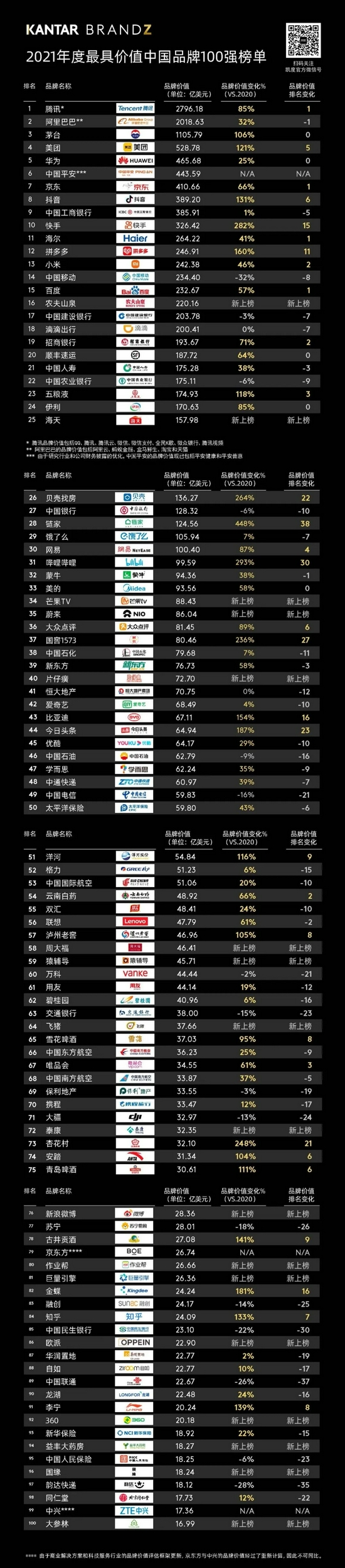 今年共有17个新上榜品牌,名列前茅的是食品饮料品牌农夫山泉(第16位,220亿美元)和海天(第25位,158亿美元),其它新上榜品牌还包括芒果TV(第34位,88亿美元)、新浪微博(第76位,28亿美元)、科技品牌360(第92位,20亿美元),以及四个零售品牌——周大福(第58位,46亿美元)、欧派(第86位,23亿美元)、益丰大药房(第94位,18亿美元)和大参林(第100位,17亿美元)。