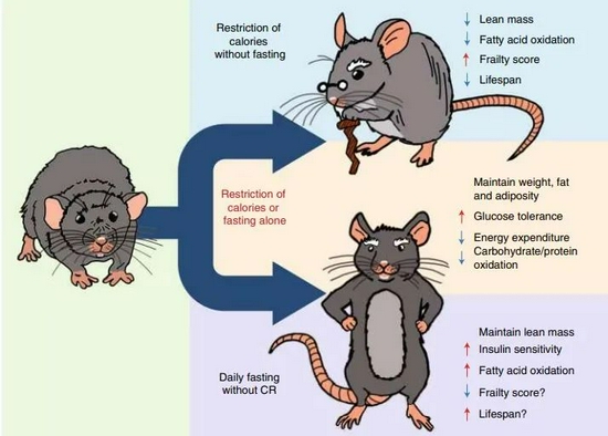 另一组实验则表明,即便没有限制热量摄入,只要每天断食——比如一天限定在3小时里进餐,小鼠也能像限制热量那样改善血糖和肝脏代谢变化。相比之下,吃得少配合断食,则可以减少老年的虚弱,延长小鼠的寿命。