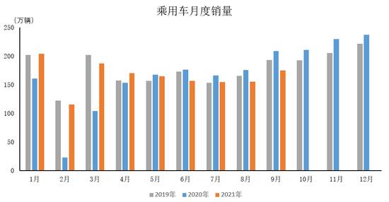 2021年1-9月,乘用车产销分别完成1465.8万辆和1486.2万辆,同比分别增长10.7%和11.0%,增幅比1-8月继续回落4.5和5个百分点,累计增速继续大幅下降;与2019年同期相比,产销同比分别下降2.9%和2.7%,降幅比1-8月分别扩大0.4和1个百分点。