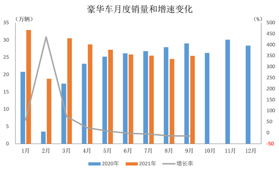 2021年9月,国内生产的豪华车同样受到芯片短缺的影响,销量完成25.4万辆,同比下降14.5%,降幅比上月继续扩大,但好于乘用车整体水平。
