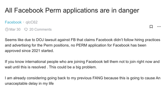 匿名职场社交软件Blind上,有Facebook员工告诫其他人,如果有签证需要,短期内不要考虑Facebook的offer。