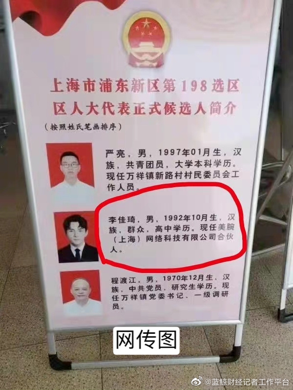 有媒体报道称,11月8日网上传出一张李佳琦参选上海浦东新区人大代表198选区候选人公示的图片,其中学历一栏所标注的高中学历,引发了网友对其学历造假的质疑。美ONE相关负责人对蓝鲸财经表示:李佳琦确实曾经就读于南昌大学,因工作原因提前离校。我们此前各项对外填报材料最高学历都是填写的高中学历。