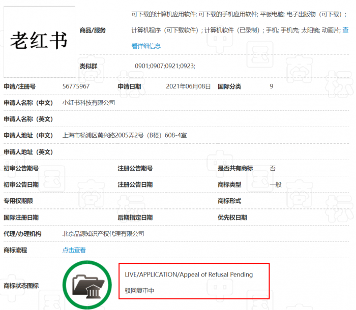 近日,小红书科技有限公司申请注册的科学仪器类“老红书”商标流程变更为“驳回复审”,该商标申请于2021年6月8日,目前状态为“驳回复审中”。不过,值得一提的是,其通讯服务类“老红书”商标申请进度已更新至“初审公告”。