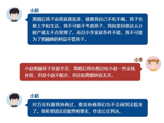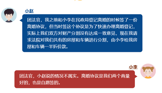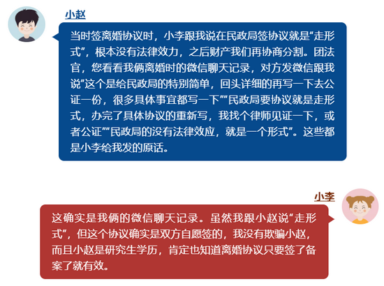 法院经审理后认为本案双方争议焦点为:小李、小赵签订《离婚协议书》中关于财产分割的约定是否成立的问题。根据小李、小赵微信聊天记录等证据证明,小李、小赵均认可前往民政局签订离婚协议是走形式,是为了顺利办理离婚登记而临时签署的协议,故可以认定双方在签订《离婚协议书》时尚未达成一致的意思表示,双方离婚协议中就财产分割达成约定的内容不成立。