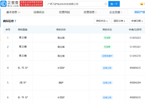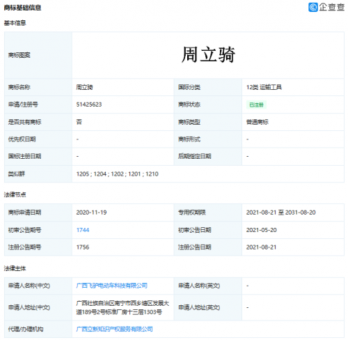 企查查APP显示,近期,广西飞驴电动车科技有限公司成功注册周立骑商标,商标国际分类涉运输工具、科学仪器,该公司成立于2020年1月,此前,该电动车公司曾发声明确认周立齐签约成为联合创始人。据悉,周立齐曾因采访时表示“打工是不可能打工的,这辈子都不可能打工”而走红。