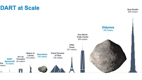 在体积方面,Dimorphos小行星大约有吉萨大金字塔那么大,而Didymos小行星的直径比纽约市世贸中心一号楼的高度还要宽。在航天器到达小行星之后,在它撞上Dimorphos之前,DART航天器将启动一个小型立方体卫星来拍摄撞击事件的照片。