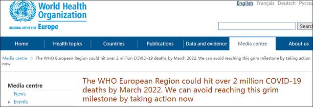 “按照目前的趋势,预计到明年春天,(欧洲)累计报告的(新冠)死亡人数将超过220万。”世卫组织警告。