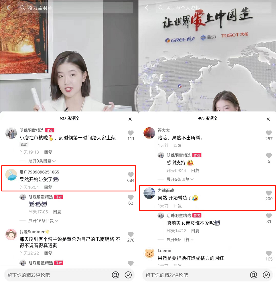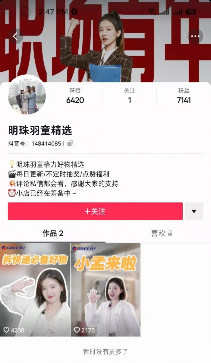 11月24日消息,近日,董明珠宣布要将22岁女秘书培养成“第二个董明珠”的事件,引发关注。其中围绕22岁女秘书孟羽童本人以及格力内部领导人换届一事也引发网友激烈讨论。近日,有网友发现,一个名为“明珠羽童精选”的抖音账号悄然注册,头像和账号名疑似表明这这是董明珠与女秘书的带货账号。