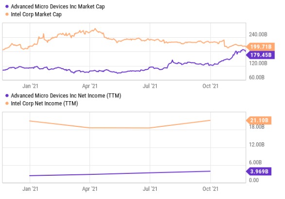 虽然AMD的增长速度肯定比英特尔快得多,但短期投资者需要关注AMD的净利润和市值。AMD最近的股价较高,不过对于那些长期投资的人来说,即使是在这个相对泡沫的估值下,AMD的未来似乎是光明的。 然而,对于短线投资者来说,这些数据表明,如果经济形势不稳或出现制造业问题,这只股票将面临大幅回调的风险。 尽管过去几个月AMD股价的势头强劲,但那些风险承受力较低的投资者或者可以等待更有吸引力的入市时机。