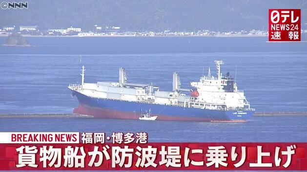 在日本港口,一艘9576吨货船“开上岸”,日本电视台29日报道,28日夜间,日本福冈博多港的西防浪堤坝北灯塔附近发生事故,一艘巴拿马籍9576吨货船撞上了防浪堤坝,导致船头冲上堤坝,动弹不得。