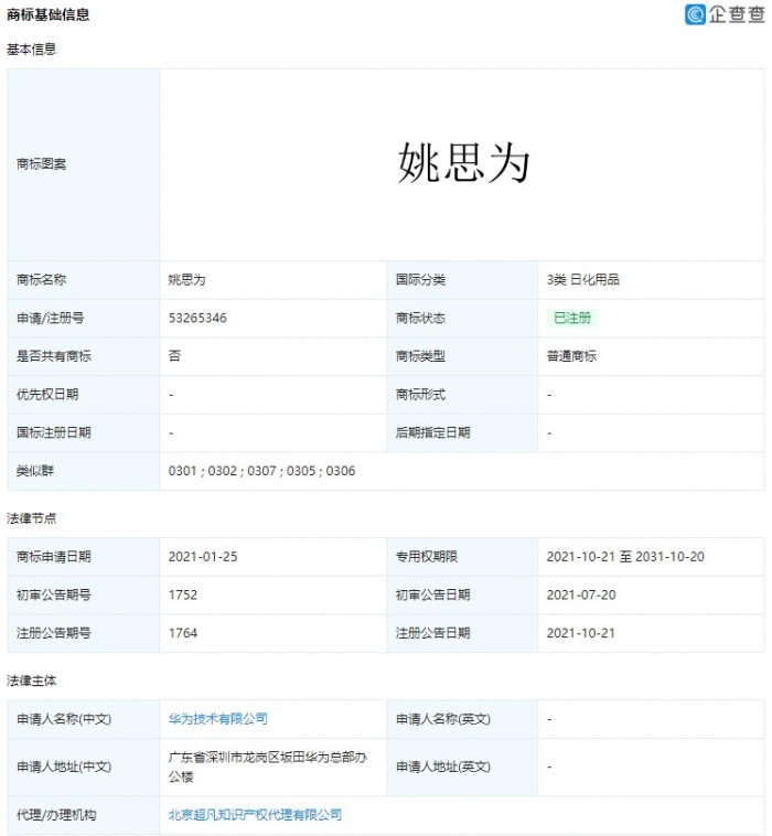 12月2日消息,企查查App显示,近期,华为技术有限公司成功注册姚思为、YAO SIWEI、ANNABEL YAO商标,商标国际分类涉及服装鞋帽、方便食品等。企查查还显示,华为目前也已经完成了姚安娜商标的注册。据悉,姚安娜原名为姚思为,为华为创始人任正非的小女儿。