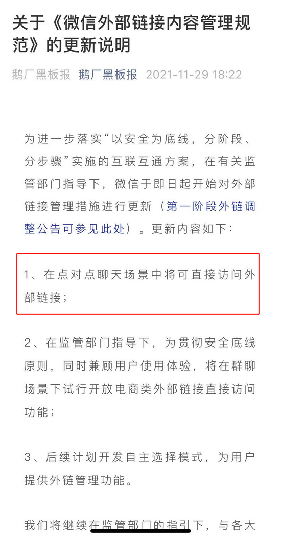 11月29日,微信放开了对外链的限制。当日发布的《关于〈微信外部链接内容管理规范〉的更新声明》(简称声明)中指出,在点对点聊天场景中可直接访问外链,群聊场景下也将试行开放电商类外部链接直接访问功能。