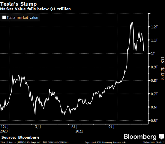 特斯拉周一跌势加剧,之前有报道称,监管机构启动了对这家电动汽车公司的调查,特斯拉股价一度创下3月以来最大四天跌幅。该股在纽约早盘交易中一度下跌6.4%至950.50美元,比11月4日触及的纪录高点1229.91美元下跌了23%。如果收盘价较该纪录高点下跌20%,标志着该股跌入技术性熊市区域。