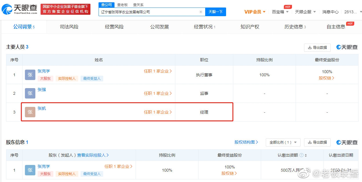 天眼查App显示,12月10日,疑似“张同学”关联公司辽宁省张同学农业发展有限公司成立。该公司注册资本500万人民币,注册地址为辽宁省营口市大石桥市建一镇松树村,法定代表人为张克学。