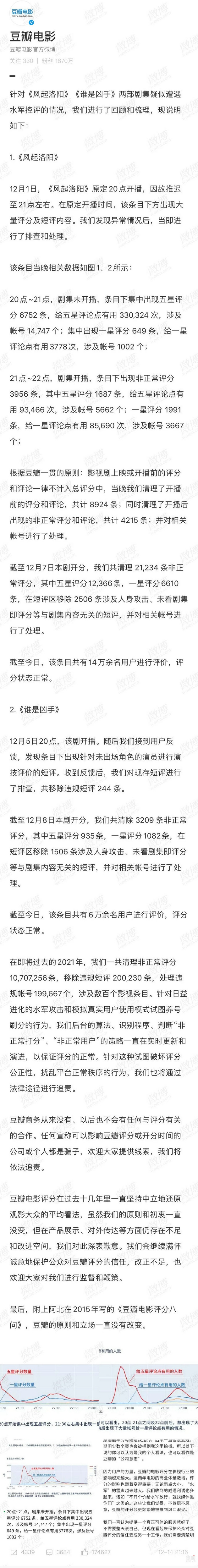 此前,正在热播的电视剧《风起洛阳》、《谁是凶手》陷水军控评争议。截止目前,《风起洛阳》豆瓣电影评分7.0,《谁是凶手》评分7.1。