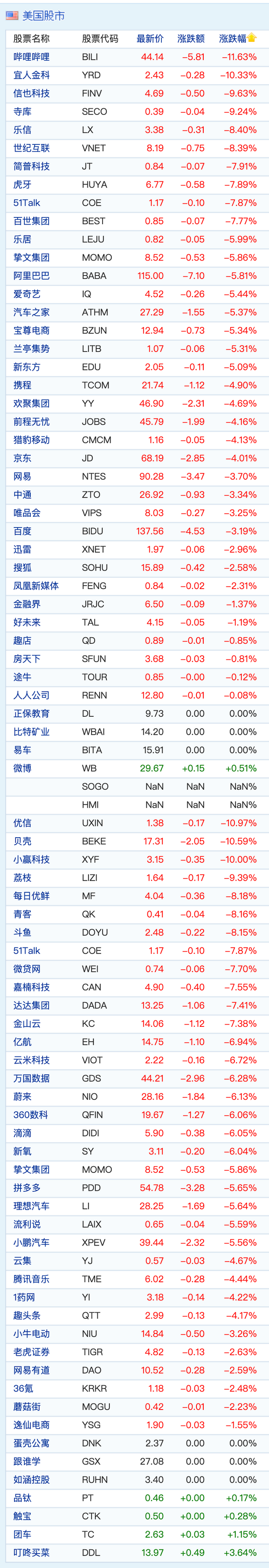哔哩哔哩跌超11%,优信跌近11%,贝壳、宜人金科跌超10%,雾芯科技跌近9%,斗鱼、世纪互联、亿邦国际跌超8%,虎牙跌近8%,金山云、微美全息、百世集团跌超7%,第九城市跌超6%,乐居、阿里巴巴跌近6%,爱奇艺、汽车之家跌超5%,拼多多、新东方、携程跌近5%,京东、欢聚集团、趣头条跌超4%,百度、网易、唯品会、瑞幸粉单跌超3%,网易有道、老虎证券、腾讯ADR跌超2%,富途控股跌超1%。