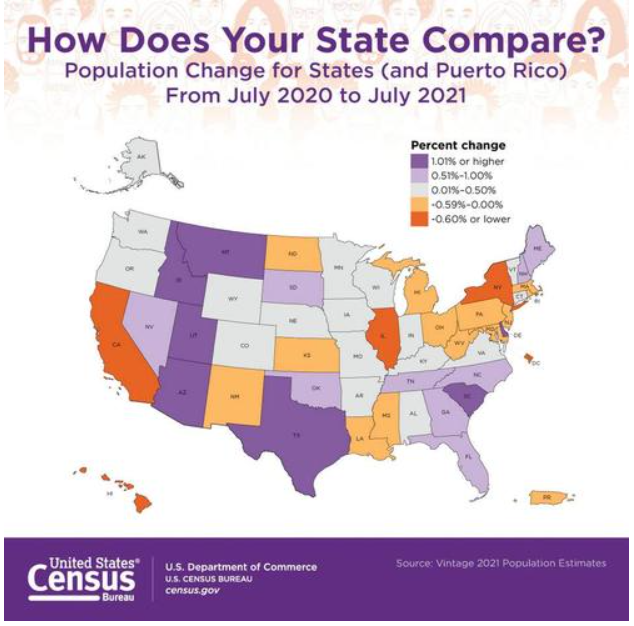 而分地区来看,在美国50州中有17个州的人口出现负增长,哥伦比亚特区(-2.9%)、纽约州(-1.6%)、伊利诺伊州(-0.9%)、加尼福尼亚州(-0.7%)和夏威夷(-0.7%)排名居前,其中加州已经是连续第二年出现人口下滑。