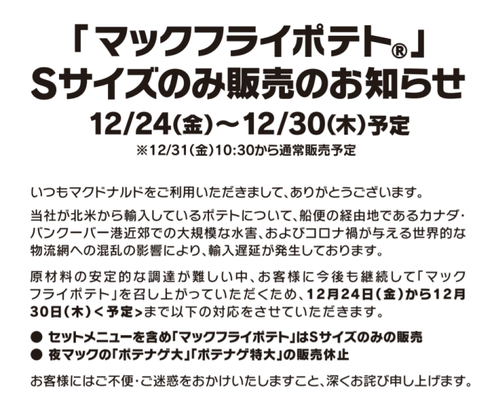 日本麦当劳表示,该国来自北美地区的薯条供应受到新冠疫情造成的世界物流网络大规模混乱,以及温哥华港洪水灾害影响。虽然跨国连锁巨头已经与供应商和进口商展开合作,安排替代物流运力,但依然无法消除相关影响。