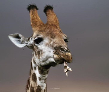 还有这张拍摄于2018年,地点不详。这只长颈鹿叼着一个羚羊头骨。