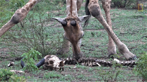这是2018年8月,拍摄于南非夸祖鲁-纳塔尔省的坦贝大象公园的视频截图,一只长颈鹿和它的同伴在一起,它嘴里还叼着一个已经腐败的水牛头。感兴趣的朋友们可以在网上搜索视频看一看。