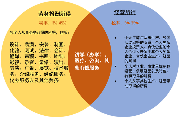 根据《个人所得税法实施条例》(下称“《条例》”),劳务报酬所得与经营所得的适用对象均包括“个人”,其所列举的劳务行为/经营行为有所重叠(如讲学(办学)、医疗、咨询、其他有偿服务等),而二者适用的税率截然不同,劳务报酬属于综合所得,适用3%-45%累进税率;经营所得则适用5%-35%累进税率(具体如下图所示)。