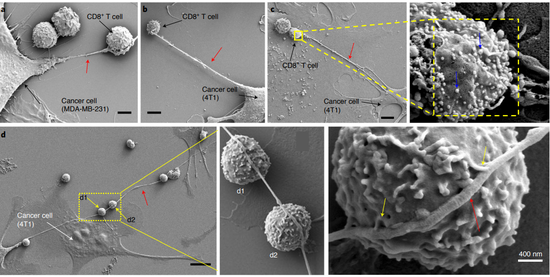 美国布莱根妇女医院的研究者将小鼠体内获取的乳腺癌细胞与免疫细胞共同放置在培养皿,16个小时后这些细胞放置在了场发射扫描电镜下进行观察,结果发现,平均下来每一个癌细胞都会与T细胞形成一根纳米管,每一根纳米管的宽度在50-2000纳米左右。